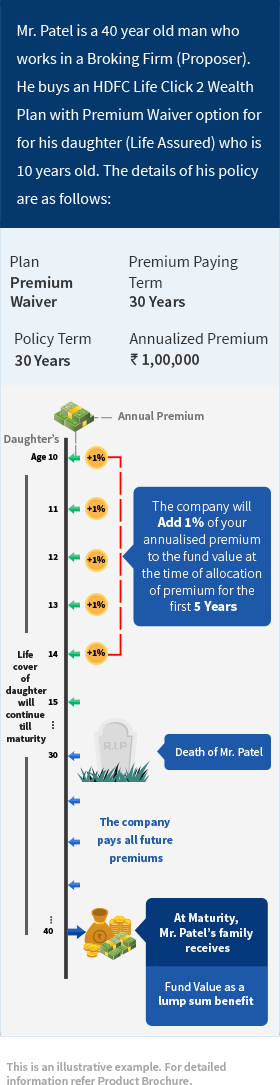 HDFC Life offers various child plans that come with exclusive features for your childs benefit and are meant for ensuring that your child can have a stress-free future from educational requirements to marriage. Flexible options of payout of the plan. HDFC Life waives off the premiums and pays 50 of the future premiums towards the policy and 50 of the premiums to the child on the premium due date. HDFC Lifes YoungStar Udaan is a traditional child insurance plan which helps you create a guaranteed corpus for your child.